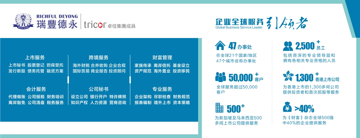 瑞豐德永(Richful Deyong)2008年始創(chuàng)于香港,系卓佳(Tricor)集團(tuán)成員,是亞洲具有領(lǐng)先地位的專業(yè)服務(wù)機(jī)構(gòu),在全球21個(gè)國家/地區(qū)47個(gè)城市設(shè)有辦事處,擁有2500多名員工,服務(wù)超過30000多客戶,1300間香港聯(lián)交所上市公司,500間新加坡和馬來西亞上市公司,名列財(cái)富雜志500強(qiáng)企業(yè)超40%及眾多跨國知名公司。